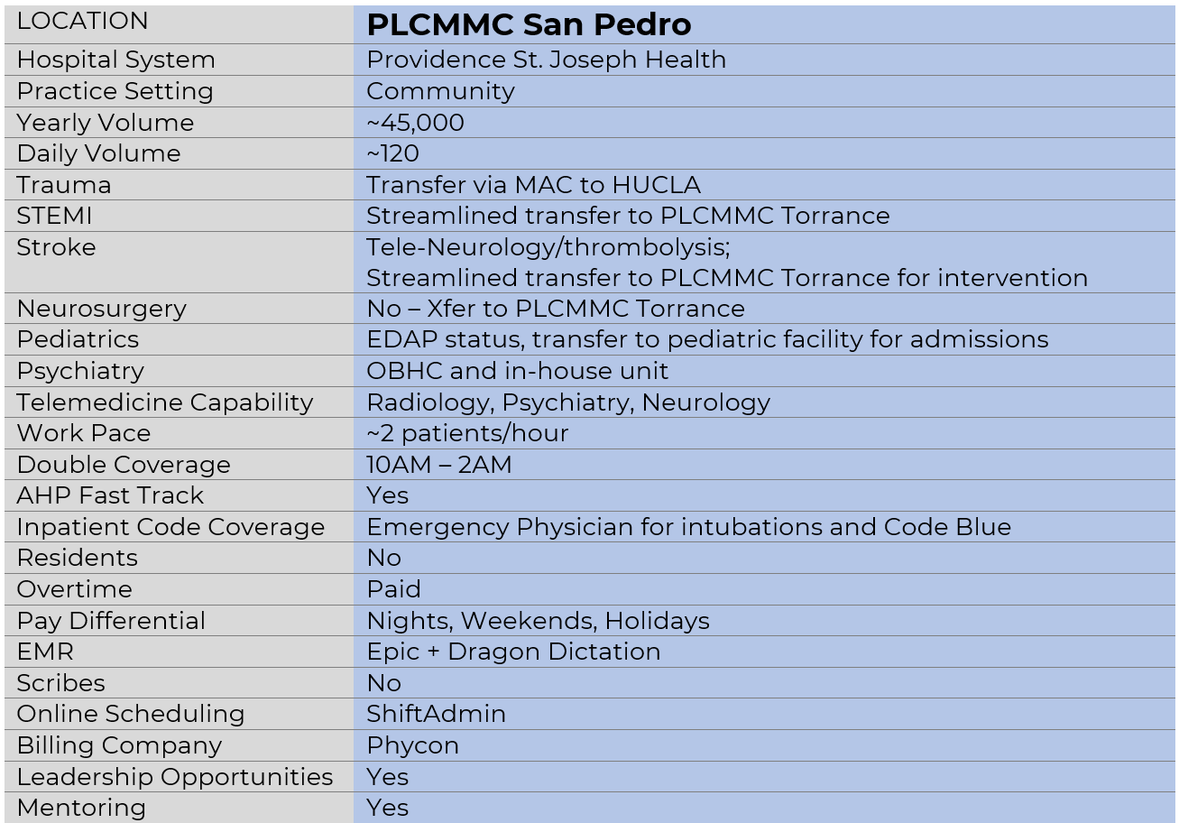 Our practice location since 1993, Little Company of Mary San Pedro is a community hospital with an annual volume of approximately 45 thousand patients. Trauma and STEMI transfers are streamlined to the local trauma center and nearby tertiary sister hospital, respectively. Medical cases are often high in acuity and complexity as the ED serves nearby subacute care and skilled nursing facilities.
